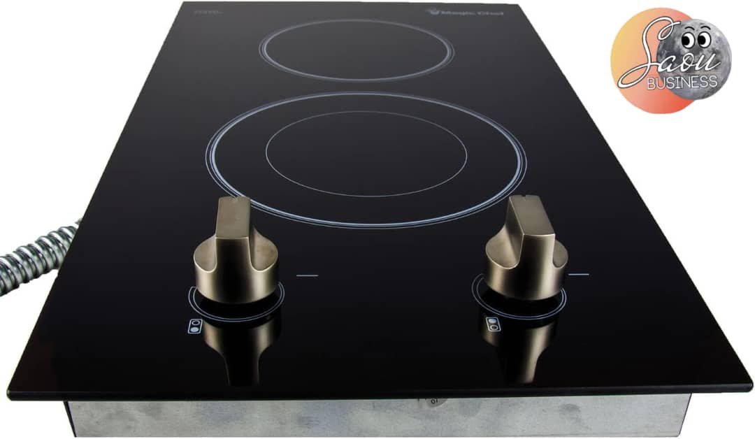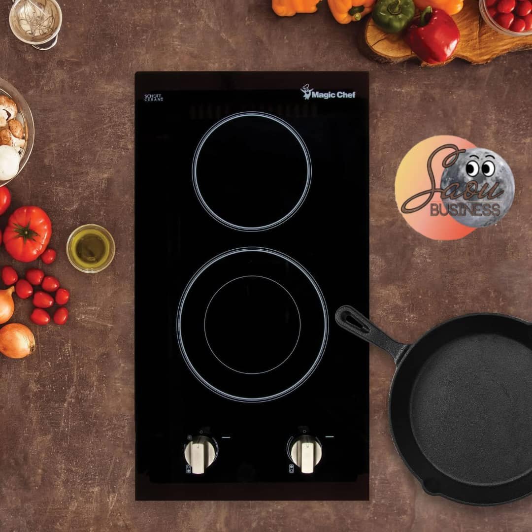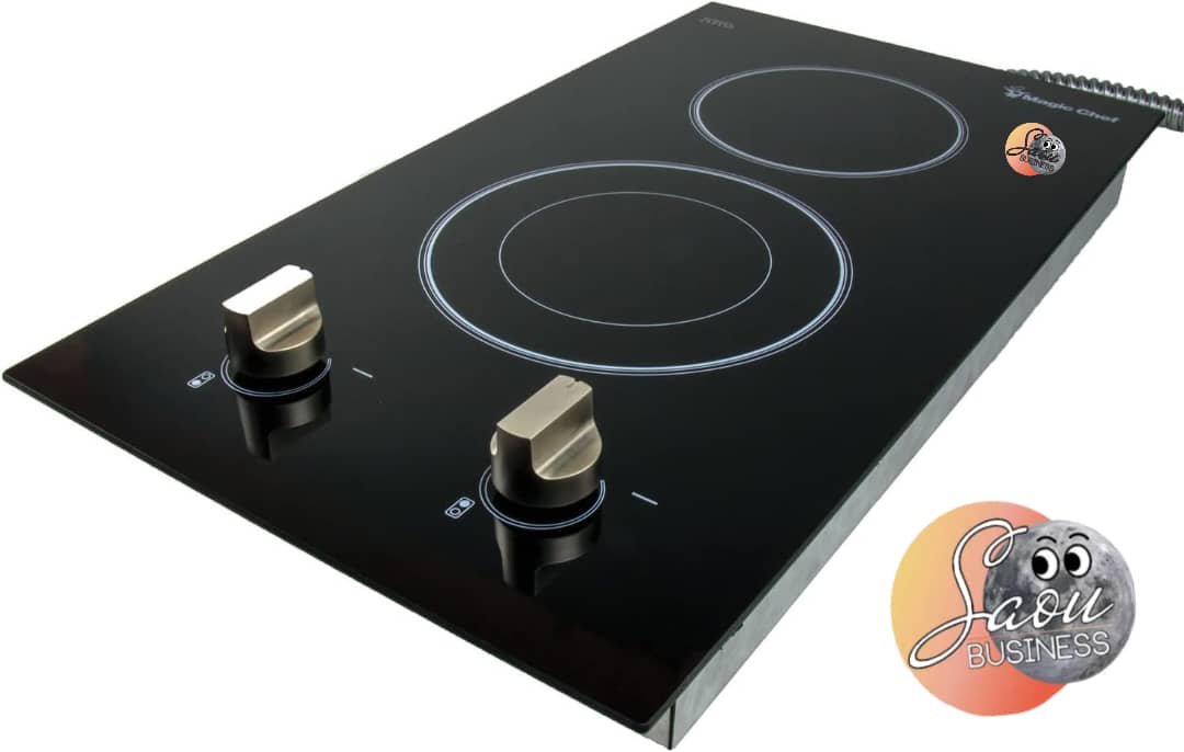 Plaque encastrable Magic Chef 2 feux induction électrique MCSCTE12BG1, avec surface en verre trempé noir, commandes tactiles, chauffe rapide et sécurité intégrée. Compacte et élégante, idéale pour les petits espaces.
